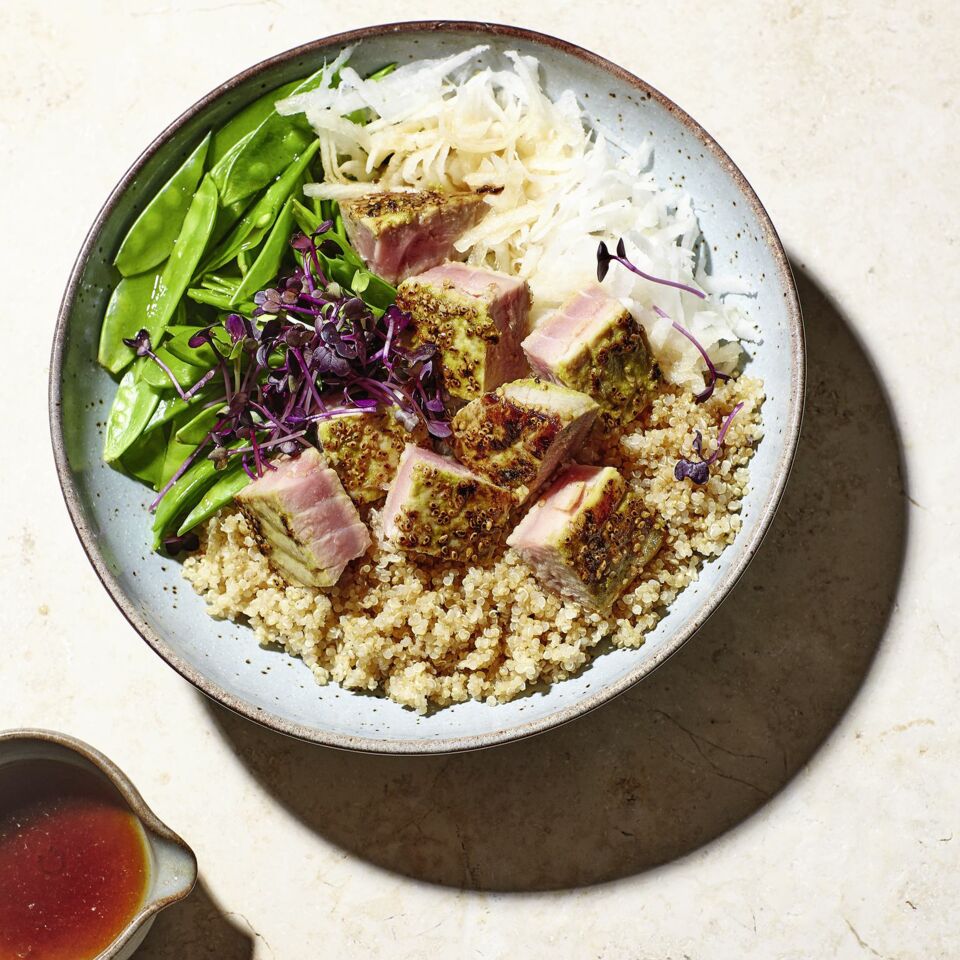 Quinoa, gedünstete Zuckerschoten, Rettichraspel und Thunfischwürfel dekorativ auf zwei Schalen verteilen und die Sesamölsauce darüberträufeln. Rettichsprossen vom Beet in ein kleines Sieb schneiden, kurz abbrausen, trocken schütteln und die Bowls damit bestreuen.