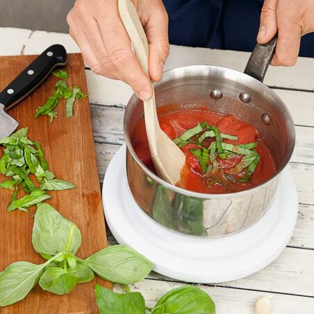 Die Tomatensauce mit 1 Prise Zucker abschmecken. Das Basilikum waschen und trocken schütteln, die Blätter abzupfen, in feine Streifen schneiden und unter die Sauce rühren. Die Tomatensauce abkühlen lassen.