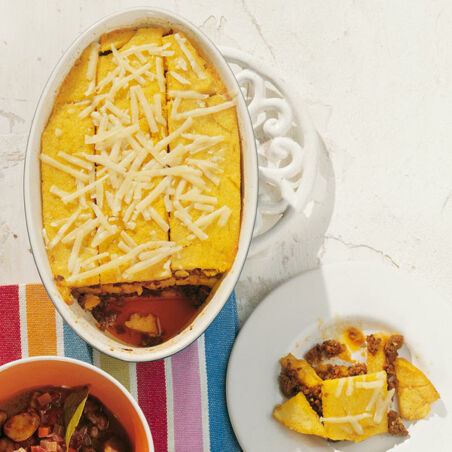 Die restliche Butter schmelzen. Eine große ofenfeste Form mit 2 EL zerlassener Butter ausstreichen. Polenta in 1 cm breite Streifen schneiden. Eine Schicht Polentascheiben in die Form legen, mit etwas zerlassener Butter beträufeln, einige Esslöffel Parmesan darüber streuen, mit Hackfleischragout bedecken, wieder eine Schicht Polentascheiben, Parmesan und Ragout einschichten und auf diese Weise fortfahren, bis alle Zutaten aufgebraucht sind (3-4 EL Parmesan zurückbehalten). Mit Polenta abschließen.
