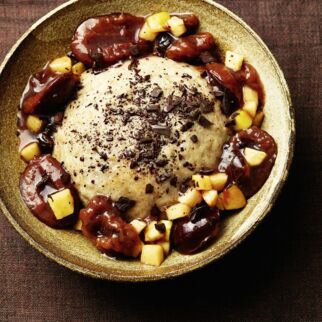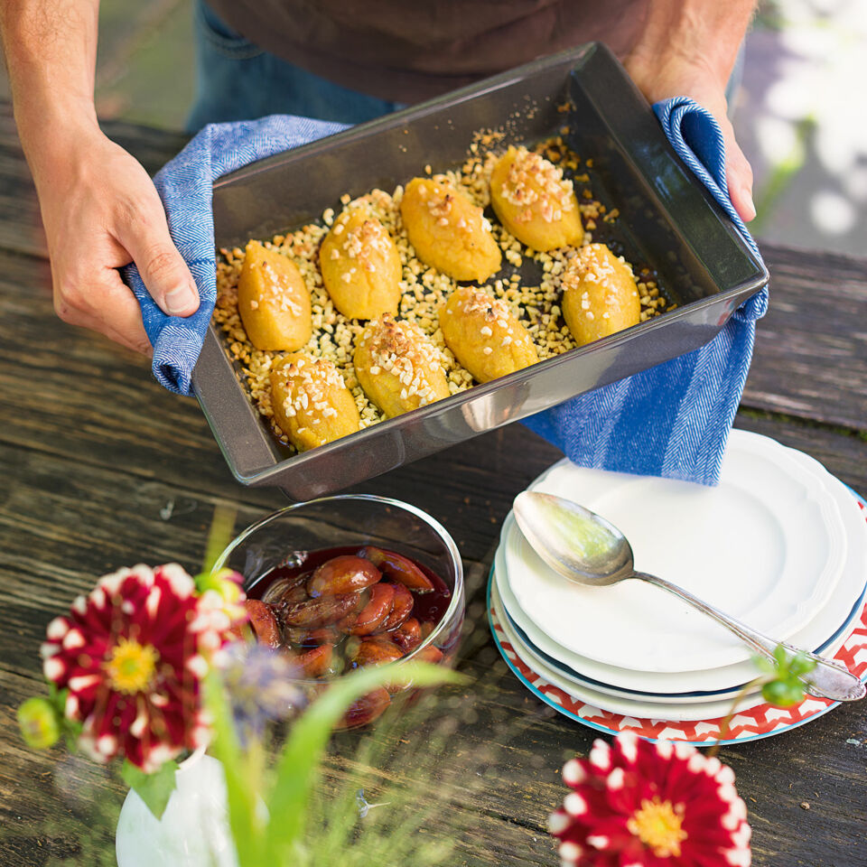 Süßes zum Sattessen. Die veganen Nocken am besten noch warm mit dem kalten Kompott schmecken lassen.