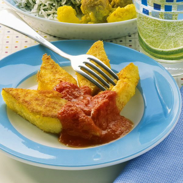 Polenta in der Pfanne in Schnitten teilen und herausnehmen. Pfanne säubern, Öl darin erhitzen. Polentaschnitten von beiden Seiten goldbraun braten. Mit der Tomatensauce servieren.