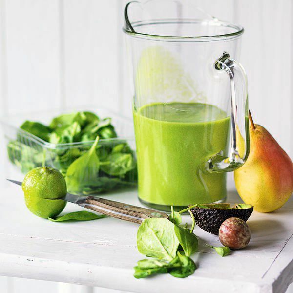 Die Birne waschen und trocken reiben. Längs halbieren und das Kerngehäuse entfernen. Das Fruchtfleisch grob würfeln. Trauben waschen, kurz abtropfen lassen und von den Stielen zupfen. Spinat waschen, ver lesen und in ein Sieb geben. Die Avocado entkernen und das Fruchtfleisch mit einem Teelöffel aus der Schale lösen.