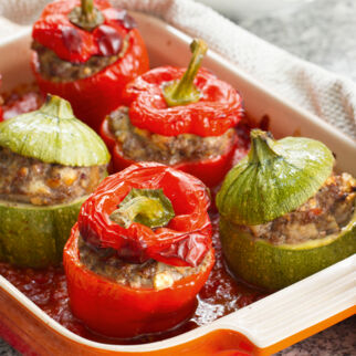Eine Auflaufform mit Butter einfetten. Die Pilze mit der Öffnung nach oben hineinsetzen und mit der Hackmasse füllen. Im vorgeheizten Ofen (Mitte) in 20 Min. garen.