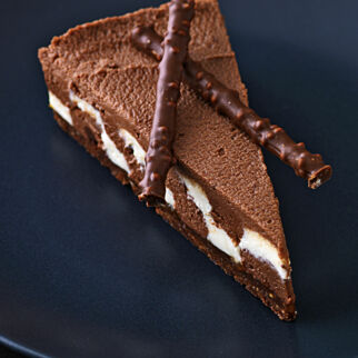 Pumpernickel von Hand oder im Blitzhacker fein zerbröseln. Die Kuvertüre grob hacken, mit der Butter in einen Topf geben und bei mittlerer Hitze schmelzen lassen. Die Pumpernickelbrösel untermischen. Eine Tortenplatte mit einem Tortenring umschließen. Die Pumpernickelmasse daraufgeben und mit der Hand flach drücken.