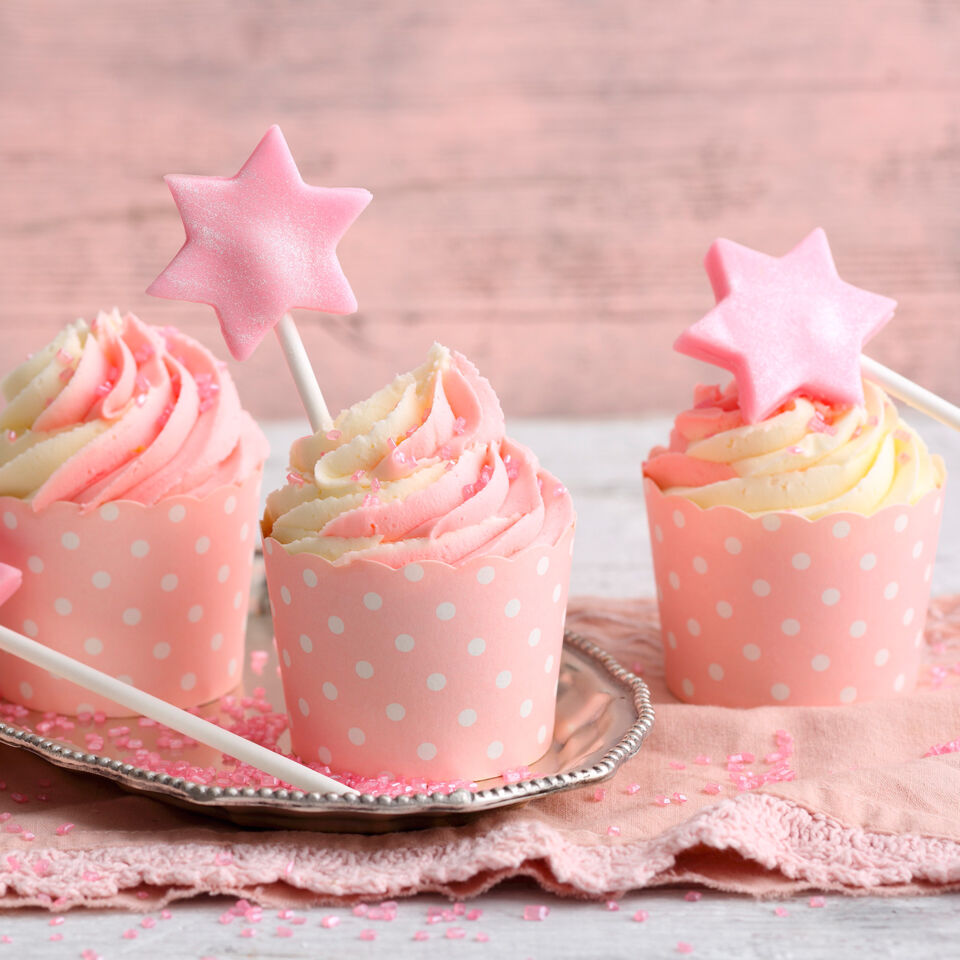 Die Buttercreme halbieren und eine Hälfte mit der Lebensmittelfarbe rosa einfärben. Die weiße und rosa Buttercreme nebeneinander in den Spritzbeutel füllen. Buttercreme auf die Muffins spritzen, mit etwas Glitter bestreuen und mit den Sternzeptern krönen.