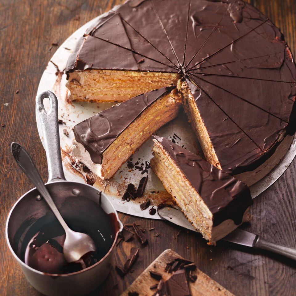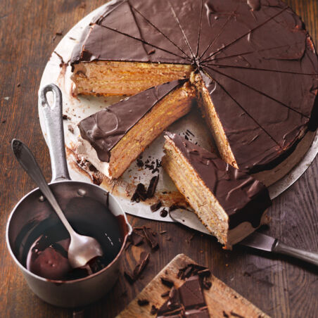 Die Butter mit dem Puderzucker schaumig rühren. Löffelweise die Creme unterrühren. Alle Teigböden - außer den obersten - mit der Buttercreme bestreichen und zusammensetzen. Für die Glasur die Kuvertüre hacken und mit Öl über dem heißen Wasserbad schmelzen. Die Torte damit überziehen. Trocknen lassen.