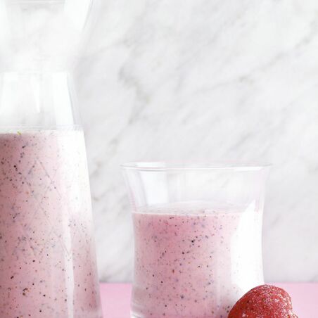 Für diesen Eiweiß-Drink musst du nicht auf die Erdbeersaison warten: Wir bereiten ihn einfach mit der tiefgekühlten Variante zu!