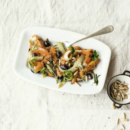 Das heimische Gemüse wird mit aromatischen Kräutern, Pinienkernen und Oliven verfeinert und passt gut als Beilage zu Fleisch aber auch als vegetarisches Hauptgericht.