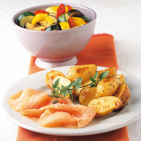 Paprika, Zucchini und Auberginen werden im Bratschlauch schonend gegart und dann mit Ofen-Kartoffeln und geräuchertem Lachs serviert. Sehr fein!