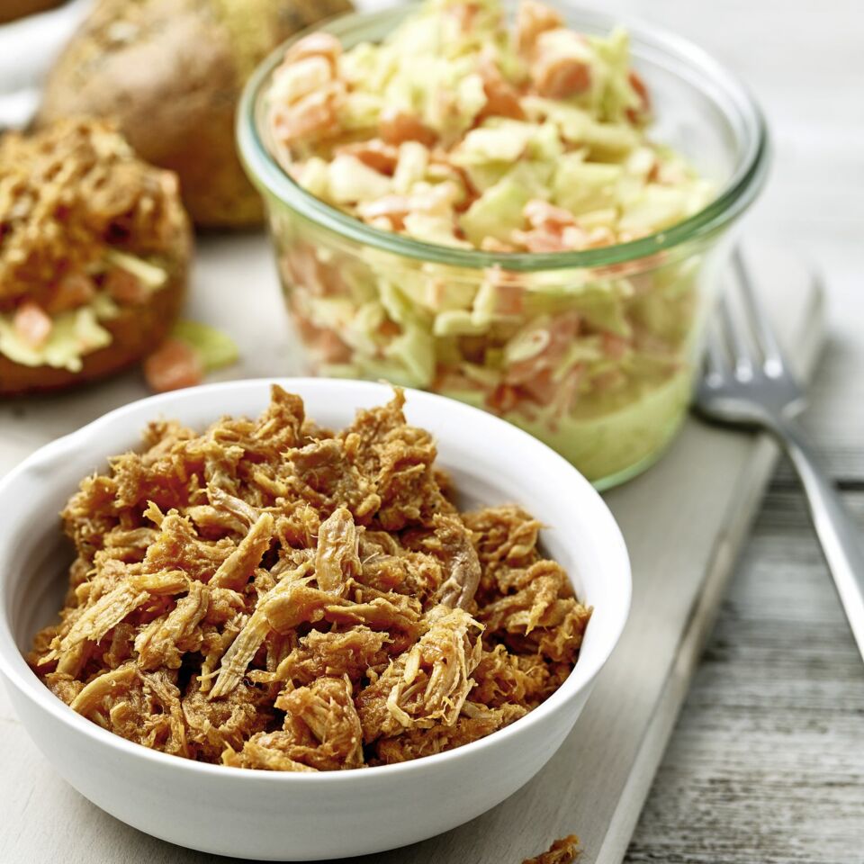 Dann das Fleisch samt Marinade und 150 g Wasser in den Mixtopf geben und zweimal 60 Min. / 100° / Linkslauf / Sanftrührstufe garen. Das Fleisch durch ein grobes Sieb abgießen, dabei die Sauce auffangen. Fleischstücke, die noch nicht zerfallen sind mit einer Gabel zerzupfen. Das Fleisch nun mit so viel Sauce mischen, dass es schön saftig aussieht, aber nicht suppt. Das Fleisch nochmals abschmecken, dann servieren, z. B. mit einem Cole Slaw.