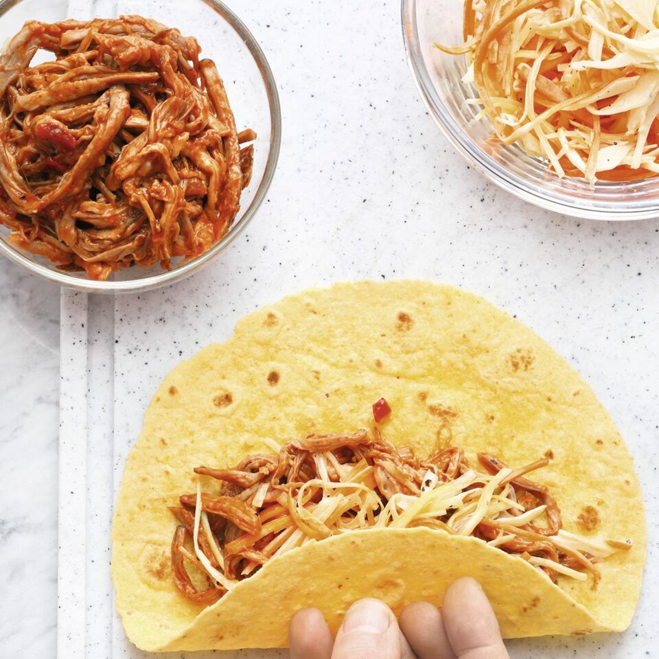 Die Tortillas nacheinander in einer beschichteten Pfanne ohne Fett ca. 10 Sek. pro Seite erwärmen. Auf die Arbeitsfläche legen und auf jede Tortilla mittig 2-3 EL Fleisch (80 g) als Streifen verteilen. Jeweils 2-3 EL Krautsalat daraufgeben und das untere Drittel nach oben klappen. Die seitlichen Ränder einschlagen und aufrollen.