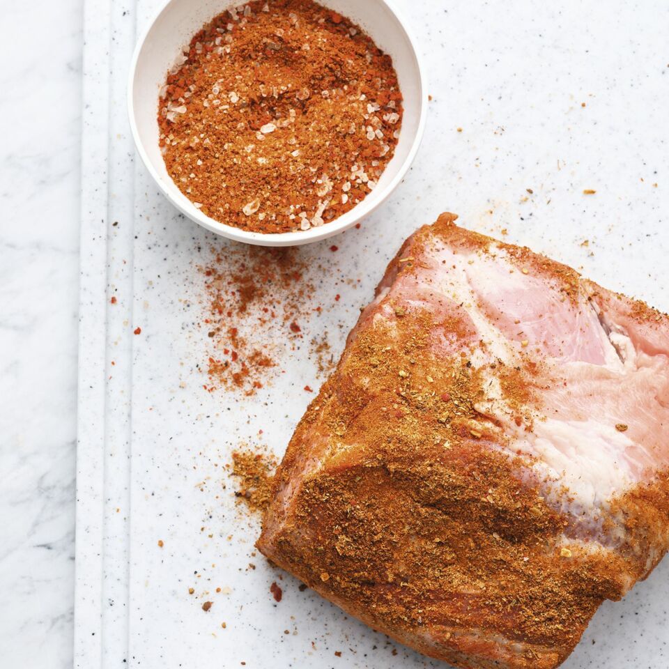 Das Sous-Vide Wasserbad auf 77° vorheizen. Das Fleisch gleichmäßig mit dem Gewürzpulver einreiben und kräftig mit Salz würzen. Das Öl in einer Pfanne erhitzen und das Fleisch darin bei mittlerer Hitze in ca. 5 Min. rundum kräftig braun anbraten. In einen Vakuumierbeutel geben und vakuumieren. Den Beutel in das temperierte Wasserbad einlegen und das Fleisch ca. 12 Std. garen.