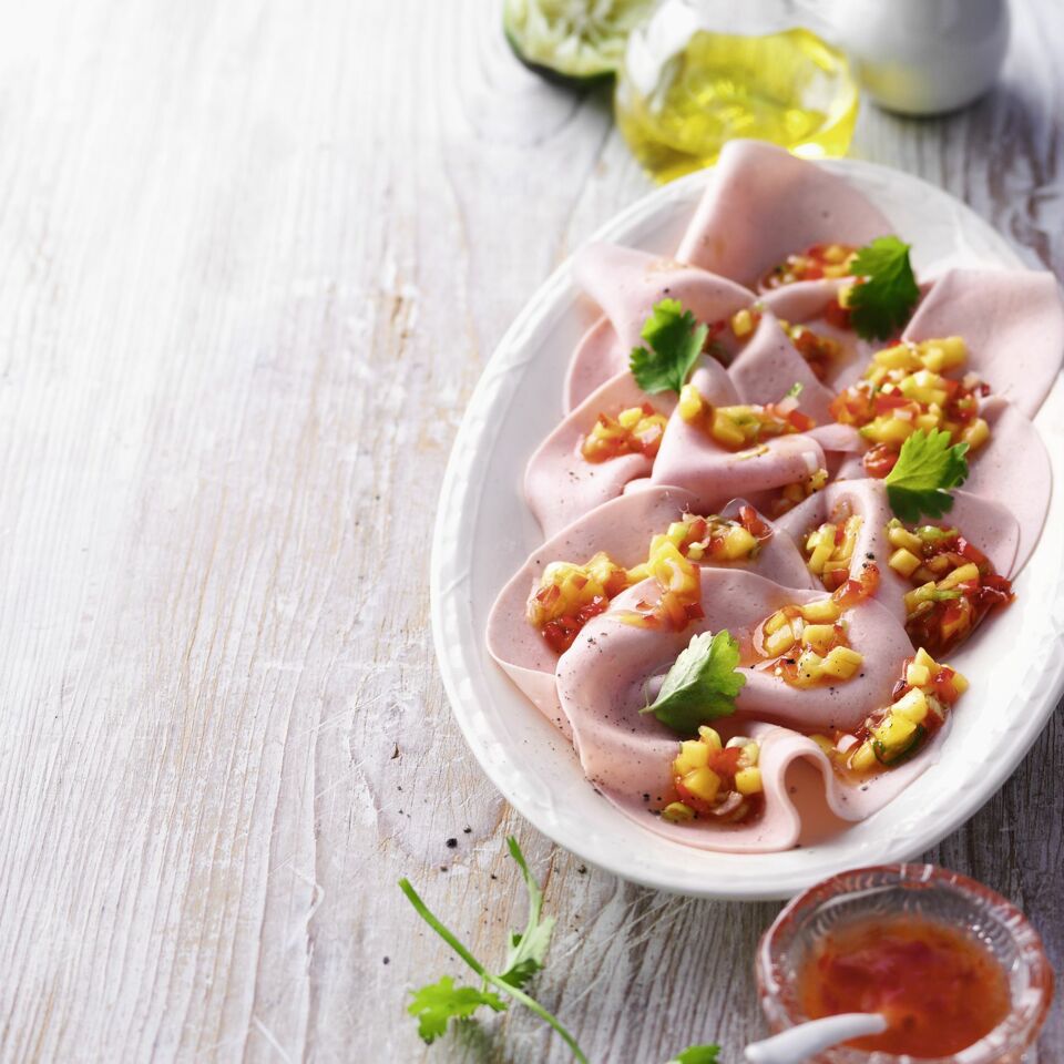 Putenbrust-Aufschnitt auf einem großen Teller auslegen. Die Mango-Paprika-Salsa darauf verteilen. Nach Belieben mit Koriander garnieren und servieren.