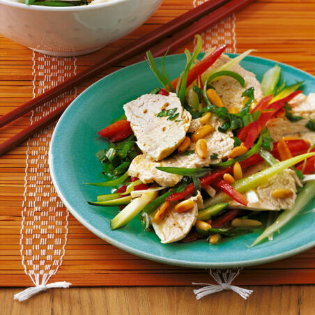 Putenfleisch aus der Brühe nehmen und in feine Scheiben schneiden. Basilikum waschen, die Blättchen kleiner zupfen. Essig mit Salz, Pfeffer und 1-2 EL Brühe verrühren. Olivenöl unterschlagen. Alle Zutaten mit der Salatsauce mischen und abschmecken. Pinienkerne ohne Fett anrösten und aufstreuen.