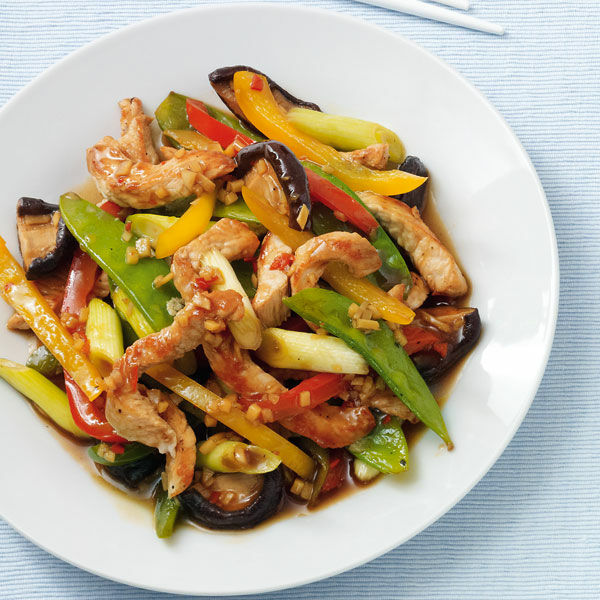 In dieser bunten Pfanne vereinen sich Paprika, Frühlingszwiebeln, Zuckerschoten, Chilischoten und Shiitakepilze zu einer asiatischen Liaison.