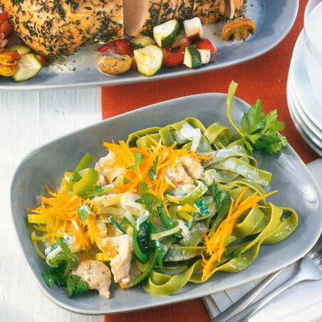 Das kochende Nudelwasser salzen, die Tagliatelle darin nach Packungsanweisung bissfest garen. In ein Sieb abgießen und abtropfen lassen. Auf vier Teller verteilen, das Geschnetzelte darüber verteilen. Mit gehackter Petersilie bestreut servieren.