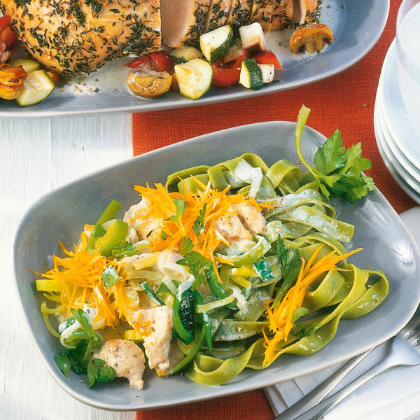 Das Fleisch waschen und mit Küchenpapier abtrocknen. In feine Streifen schneiden und mit dem Mehl mischen. Den Lauch putzen, in Ringe schneiden, waschen und abtropfen lassen. Den Kürbis schälen, entkernen und mit einem Juliennehobel in Stifte schneiden. Für die Nudeln 5 l Wasser zum Kochen bringen.