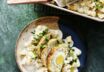 In einem kleinen Topf Gemüsebrühe und Kräuterfrischkäse erhitzen, bis der Frischkäse geschmolzen ist. Mit Salz und Pfeffer abschmecken. Das gekochte Ei kalt abschrecken und pellen. Das Ei mit der Hackfleischmasse ummanteln und den Braten mittig in die Auflaufform legen.