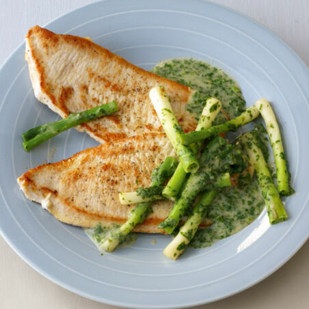 Putenschnitzel mit Frühlingszwiebeln und grüner Sauce
