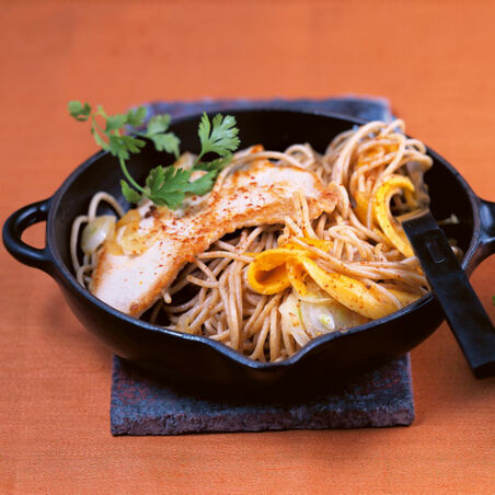 Die Nudeln in ein Sieb abschütten, kalt abschrecken, gut abtropfen lassen und in die Pfanne geben. Ca. 1 Min. anbraten und mit Salz, Cayennepfeffer und gemahlenem Koriander pikant abschmecken.