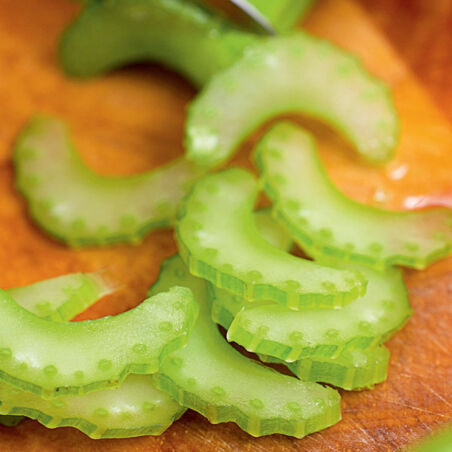 Die Selleriestangen waschen und das Grün und die unteren Enden abschneiden. Wenn sich dabei Fäden lösen, werden sie einfach abgezogen. Zartes Selleriegrün beiseitelegen. Selleriestangen in Scheiben schneiden und im elektrischen Blitzhacker mittelgrob hacken.
