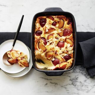 Für ein Hauptgericht die Auflaufform (für ein Dessert 6 kleine ofenfeste Förmchen) einfetten, Pflaumenkompott hineingeben. Quarkmasse vorsichtig darauflöffeln. Butter in Flöckchen darüber verteilen. Auflauf im heißen Ofen (Mitte; Umluft 160°) 40-45 Min. backen. Mit Puderzucker bestäubt servieren.
