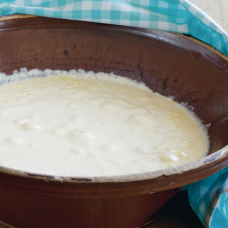 Die Milch mit Buttermilch oder Joghurt in einer flachen Porzellan- oder Tonschale glatt verrühren. Die Schale mit einem sauberen Geschirrtuch bedecken und an einem warmen Ort (aber nicht in der Sonne!) 2 Tage stehen lassen, bis die Milch stockt und dicklich wird.