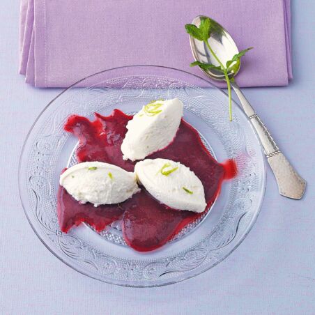 Beerensauce auf zwei Dessertteller verteilen. Mit einem Esslöffel Nocken aus der Quarkmousse stechen und auf die Sauce setzen. Mit Minze garnieren.