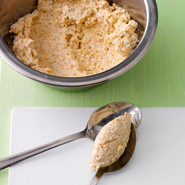 Den Quark mit Ei, Haferflocken, gemahlenen Mandeln und Honig cremig rühren und kurz quellen lassen.