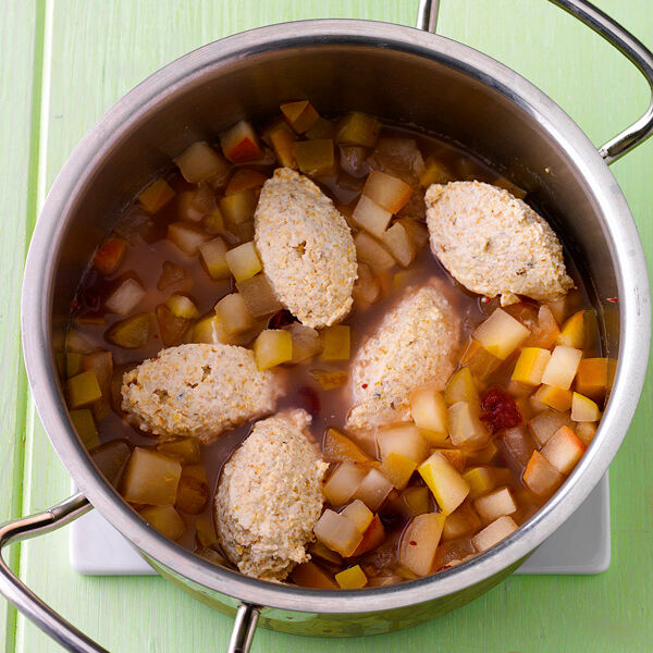 Inzwischen die Äpfel waschen, vierteln und die Kerngehäuse entfernen. Äpfel in kleine Stücke schneiden oder raspeln und mit ½ l Wasser, Cranberrys und Zimt in einem flachen, breiten Topf langsam zum Kochen bringen. Zugedeckt bei schwacher bis mittlerer Hitze ca. 10 Min. kochen - evtl. etwas Wasser dazugeben. Die Zimtstange herausnehmen.
