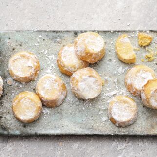Die Butter in einem kleinen Topf schmelzen. Den Puderzucker in eine kleine Schüssel geben. Die Mini-Stollen aus dem Ofen nehmen, sofort mit der geschmolzenen Butter bepinseln und im Puderzucker wälzen. Dann auskühlen lassen. Wenn der Puderzucker beim Auskühlen einzieht, das Konfekt danach nochmals im Puderzucker wälzen.