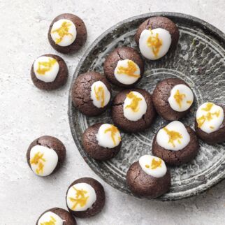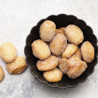 Den Backofen auf 180° vorheizen, ein Backblech mit Backpapier belegen. Aus dem Teig 40 unregelmäßig ovale Bällchen mit 4 cm Länge formen. Die Mini-Stollen auf das Backblech legen und im Ofen (Mitte) 15-17 Min. backen.