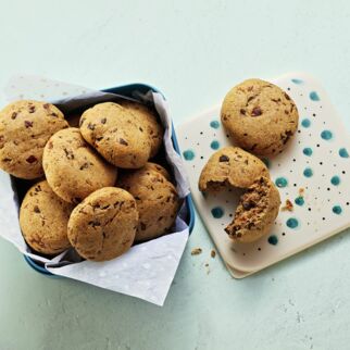 Das Mehl mit Backpulver, Zimt und 1 Prise Salz mischen. Butter und Zucker in einer Rührschüssel mit den Rührbesen des Handrührgeräts hellcremig rühren. Den Quark kurz unterrühren. Mehlmischung, Mandelstifte und Cranberrys zufügen und ebenfalls einrühren. Ist der Teig zu fest, die Milch einrühren, bis er sich gut formen lässt.