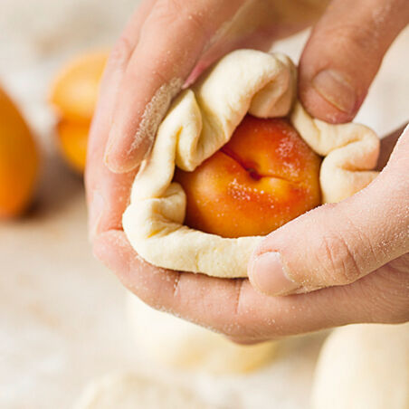 Die Aprikosen mit je 1 Stück Würfelzucker füllen. Teig auf einer leicht bemehlten Arbeitsfläche zu einer dicken Rolle (ca. 5 cm Ø) formen und diese in 16 Scheiben schneiden. Jede Teigscheibe zwischen den Händen flach drücken und je 1 gefüllte Aprikose darin einwickeln, die Teigränder sorgfältig zusammendrücken.