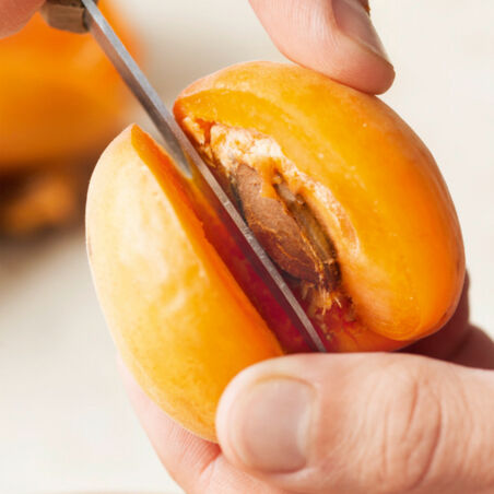 Dann die Aprikosen waschen und so einschneiden, dass man die Steine herausnehmen kann, die Fruchthälften aber noch zusammenhängen. Die Aprikosen entsteinen.