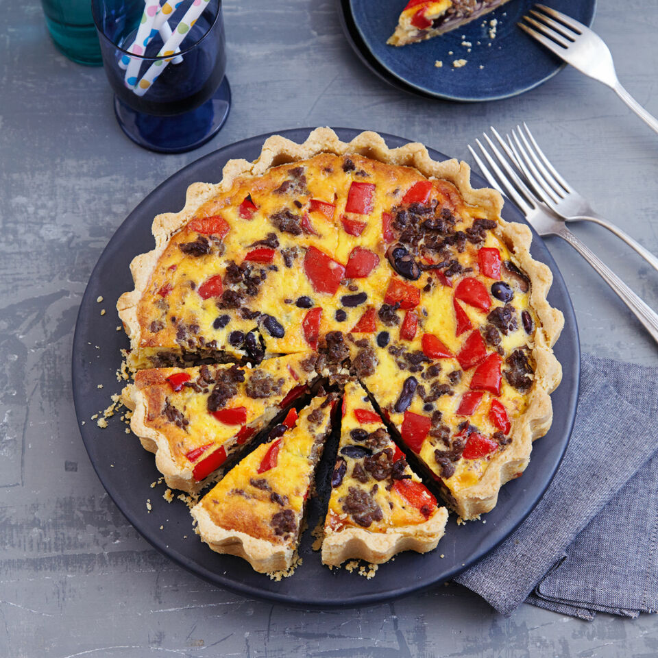 Erst die Hackfleischmischung, dann den Guss auf dem Teigboden verteilen. Die Quiche im heißen Backofen (Mitte) ca. 35 Min. backen, bis die Eiermasse gestockt und leicht gebräunt ist. Die Quiche aus dem Ofen nehmen, etwas abkühlen lassen, in Stücke schneiden und lauwarm oder auch kalt servieren.