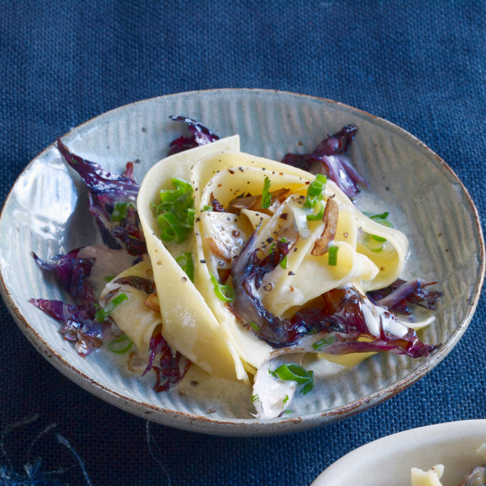 Den Radicchio putzen, waschen, vierteln und in Streifen schneiden. Die Frühlingszwiebeln putzen und waschen. Die weißen und grünen Teile getrennt in Ringe schneiden. Den Knoblauch schälen und in dünne Scheibchen schneiden. Nach Belieben die Chilischote fein zerkrümeln.