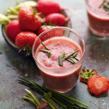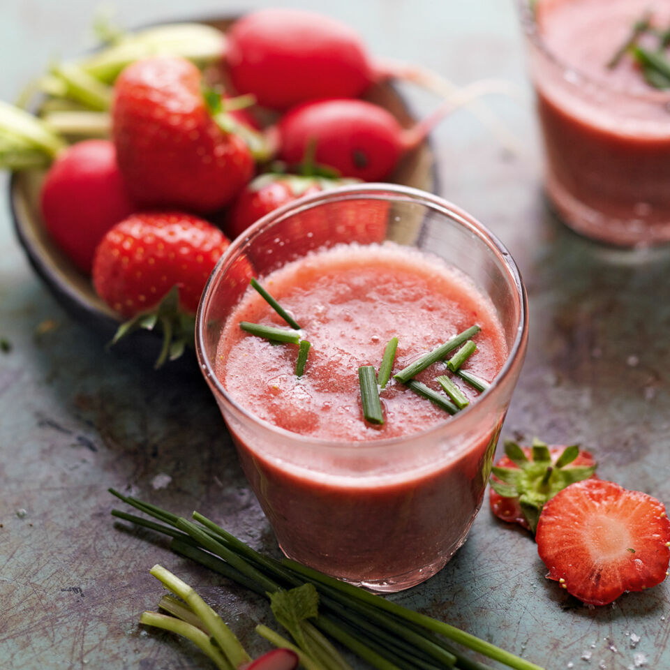 Die Erdbeeren, die Radieschen und den Schnittlauch in einen Standmixer geben, fein pürieren. Mit wenig Salz abschmecken.