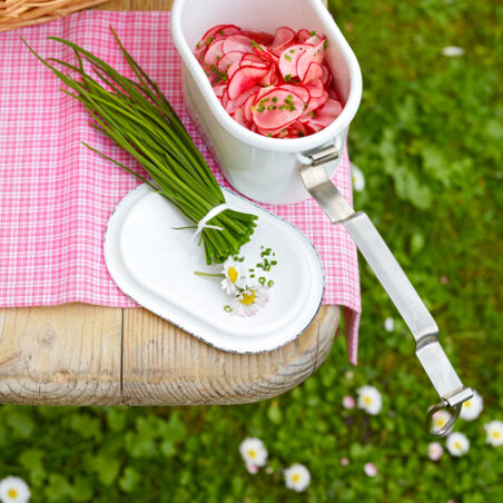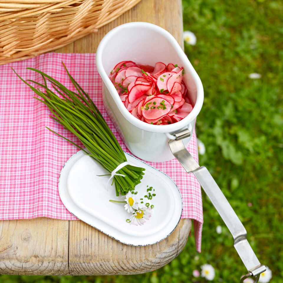 Den Schnittlauch abbrausen, trocken schütteln und in feine Röllchen schneiden. Kurz vorm Servieren den Schnittlauch unter die Radieschen mischen und den Salat abschmecken.