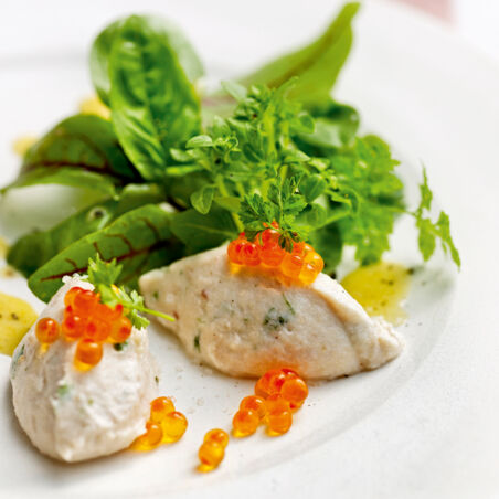 Die Creme zugedeckt im Kühlschrank 1 Std. kühlen. Zum Servieren mit zwei Teelöffeln Nocken von der Creme abstechen und formen, dabei die Löffel zwischendurch in kaltes Wasser tauchen.