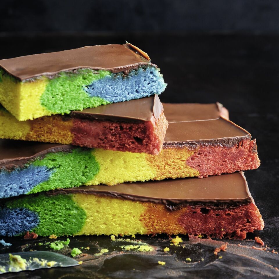 Den zubereiteten Teig in fünf Portionen teilen, jede mit etwas Lebensmittelfarbe einfärben. Die Teigportionen nebeneinander in der Backform verteilen, glatt streichen und im heißen Ofen (Mitte) ca. 20 Min. backen, dann ca. 5 Min. abkühlen lassen.