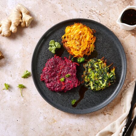 Die bunten Farben dieser knusprigen Puffer sorgen auch auf dem Teller für gute Laune!