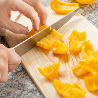 Mit einem kleinen Messer die weißen Trennhäute und Kerne herausschneiden bzw. herausstreifen. Das Fruchtfleisch der Paprika ca. 2 cm groß würfeln. Die Zwiebeln schälen, halbieren und in große Würfel schneiden.
