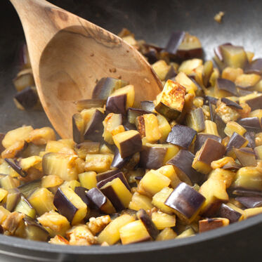 Auberginen in einer beschichteten Pfanne ohne Fett ca. 10 Min. rösten, dabei einen Deckel so auf die Pfanne legen, dass er nicht ganz schließt, und häufig umrühren oder schwenken. Auberginen in eine Schüssel geben.