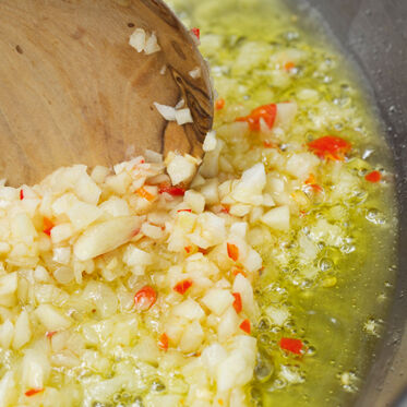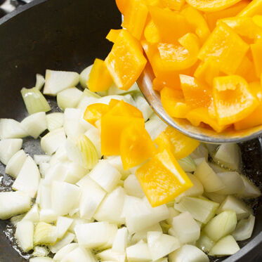 3 EL Olivenöl in die Pfanne gießen, Paprika und Zwiebeln dazugeben und ca. 8 Min. zugedeckt schmoren, dabei gleich zu Beginn salzen. Ab und zu umrühren. Zucchini dazugeben, umrühren und in 4 Min. fertig schmoren.