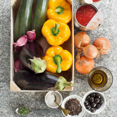 Schwarze Oliven, Auberginenwürfel und die Paprika-Zucchini-Zwiebel-Mischung unter die Tomaten rühren, noch 2 Min. kochen lassen, mit Salz und Pfeffer abschmecken.