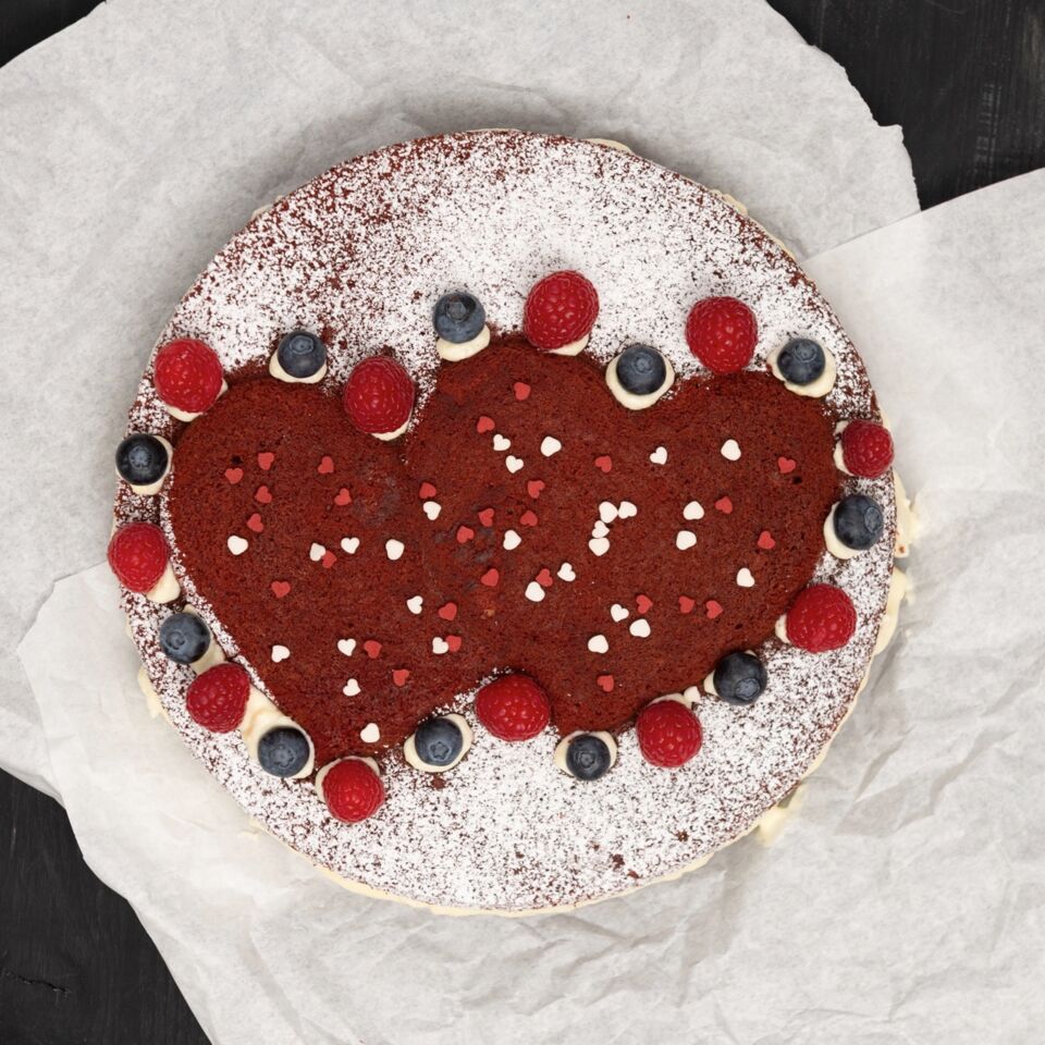 Der perfekte Kuchen für den Valentinstag – luftiger Red Velvet-Cake mit einer cremigen Frischkäse-Creme und frischen Beeren.