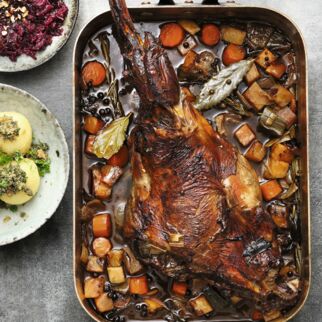 Die Keule in einen Bräter geben und offen in den heißen Ofen schieben. Nach etwa 10 Min. den Deckel auflegen, die Hitze auf 160° reduzieren und 1 Std. schmoren lassen. Wenn die Kerntemperatur 70° erreicht hat, den Ofen ausschalten und die Keule mindestens 5 Minuten nachziehen lassen. Anschließend aufschneiden.