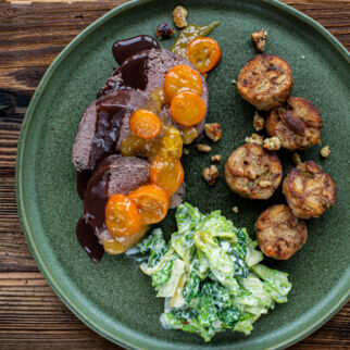 Rehkeule mit Pfefferkirschen und Serviettenknödel