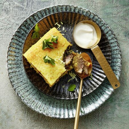 Den Backofen auf 200° vorheizen, dabei übriges Öl (3 EL) und 3 EL Butter in der Form im Ofen mit erhitzen. Gut die Hälfte vom Joghurtreis glatt in der Form verteilen. Das Fleisch samt Sauce daraufgeben, dabei rundum 3 cm Rand lassen. Nacheinander übrigen Joghurtreis und restlichen Reis darauf verteilen und fest in die Form drücken. Die übrige Butter (1 EL) in Flöckchen daraufsetzen. Die Form mit Alufolie verschließen und den Auflauf im Ofen (unten) 1 Std. 30 Min. -2 Std. garen. Herausnehmen und 10-15 Min. ruhen lassen. Den Auflauf dann auf eine Platte stürzen und servieren.